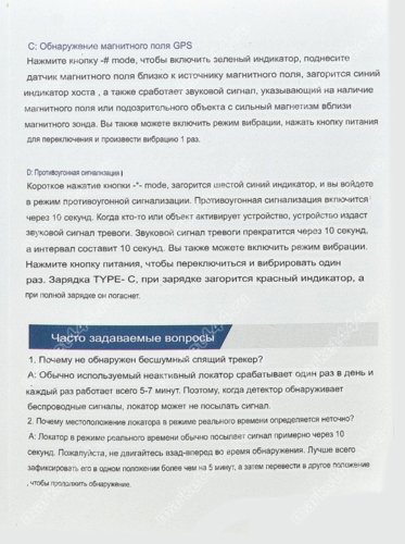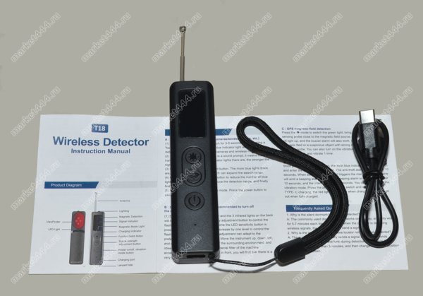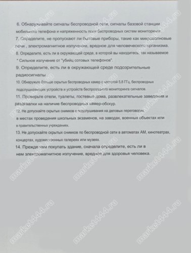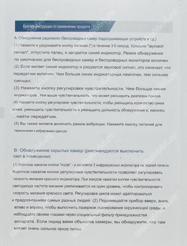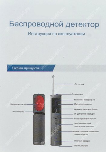 Режимы работы, поиска 1) Электромагнитному излучению. 2) Магнитному полю. 3) Визуальный поиск скрытых микро видеокамер при ИК. 4) Фонарик. 5) Противоугонная сигнализация.