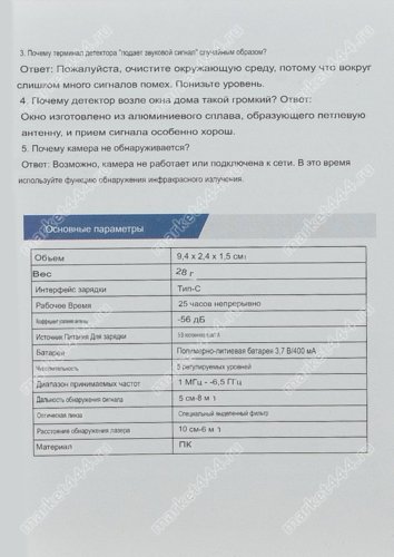 Характеристики Детектор прослушки и скрытых камер Сыщик 32