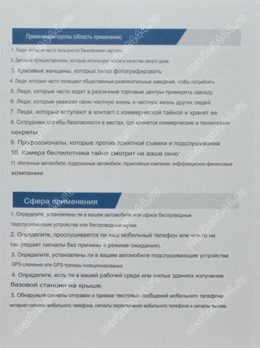 Возможные места для использования прибора. Ванные, раздевалки, казино, квартиры, помещения для проведения важных переговоров, экзаменов, семинаров, транспортные средства.